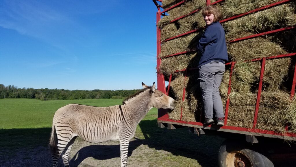 Zebb is a z-donk (or zonkey) hybrid. His mother was a standard donkey, and his father a Grevies Zebra. He joined our farm at 7-years-old, from a petting zoo. He prefers to have all attention focused only on him, and is happiest grazing out by a campfire party, or having his head scratched during a play session. Zebb was featured on the “Rachael Rae Show” in Manhattan, NY in 2008, and is always a highlight for farm visits.